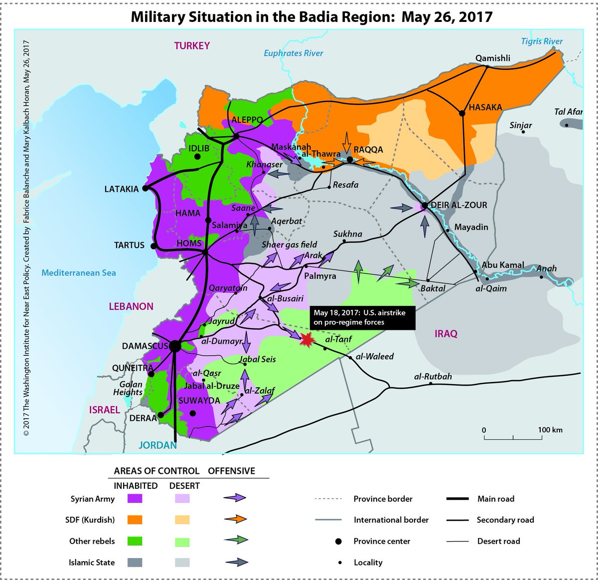 Im Dreiländereck JOR _ SYR _IRK im Raum al-Tanf deutet sich eine Lageverschärfung zwischen U.S. und British Special Forces sowie Assad freundlichen Truppen an; die SOF der Coalition bilden in einer mit Radius 55 km eingerichteten De-Conflictionzone anti-Assadkräfte ausbilden.