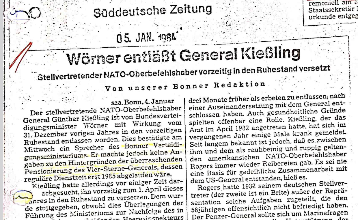 Anfang Januar 1984 brachte Szandar mit einer – nur mit dem Kürzel sza gezeichneten – Meldung in der Süddeutschen Zeitung die Kießling-Affäre ins Rollen. Warum der damalige Verteidigungsminister Manfred Wörner den Vier-Sterne-General vorzeitig und noch dazu ohne den üblichen großen Zapfenstreich in den Ruhestand schickte, hat die Neugier des Journalisten in der Bonner SZ-Redaktion geweckt. Am Ende standen ein rehabilitierter General und ein politisch beschädigter Minister.