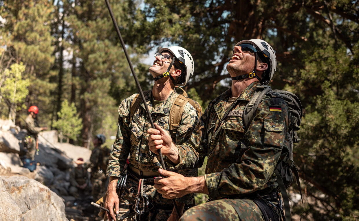 (Archivbild September 2025: German Army Hauptfeldwebel Christian Ophoven with 7th Medical Regiment, 2 Koblenz, right, and U.S. Navy Corpsman 3rd Class Ian Corcoran, Arizona native, squadron corpsman with Marine Aviation Logistics Squadron 14, Marine Aircraft Group 14, 2nd Marine Aircraft Wing, left, holds the rope for another student during a rappelling exercise as part of Mountain Medicine 3-25 at Marine Corps Mountain Warfare Training Center, Bridgeport, California, Sep. 5, 2025. – U.S. Marine Corps photo by Lance Cpl. Enge You)