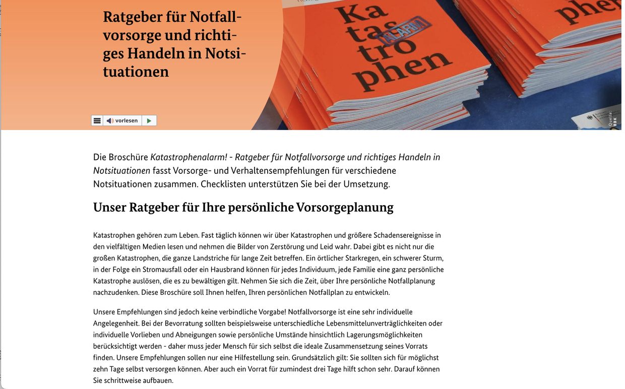 Die Aufmerksamkeit in Deutschland für solche Ratgeber, die über Was tun bei Überschwemmung hinausgehen, ist nicht zuletzt mit den immer wieder neu aufgelegten Ausgaben der entsprechenden Broschüre in Schweden gestiegen. (Auch wenn die gesellschaftliche Situation in dem skandinavischen Land und der Umgang mit Krisen oder möglichen Kriegsbedrohungen ein anderer ist.)