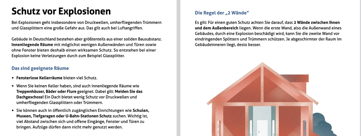 Folgerichtig enthält die Neuausgabe auch Hinweise und Handlungsempfehlungen, die in den früheren Ratgebern keine Rolle spielten. Schutz vor Explosionen wurde bislang nicht erwähnt, jetzt ist dem eine Doppelseite gewidmet (Das gilt auch bei Luftangriffen). Ähnliches gilt für das Erkennen falscher Informationen oder Cyberangriffe.