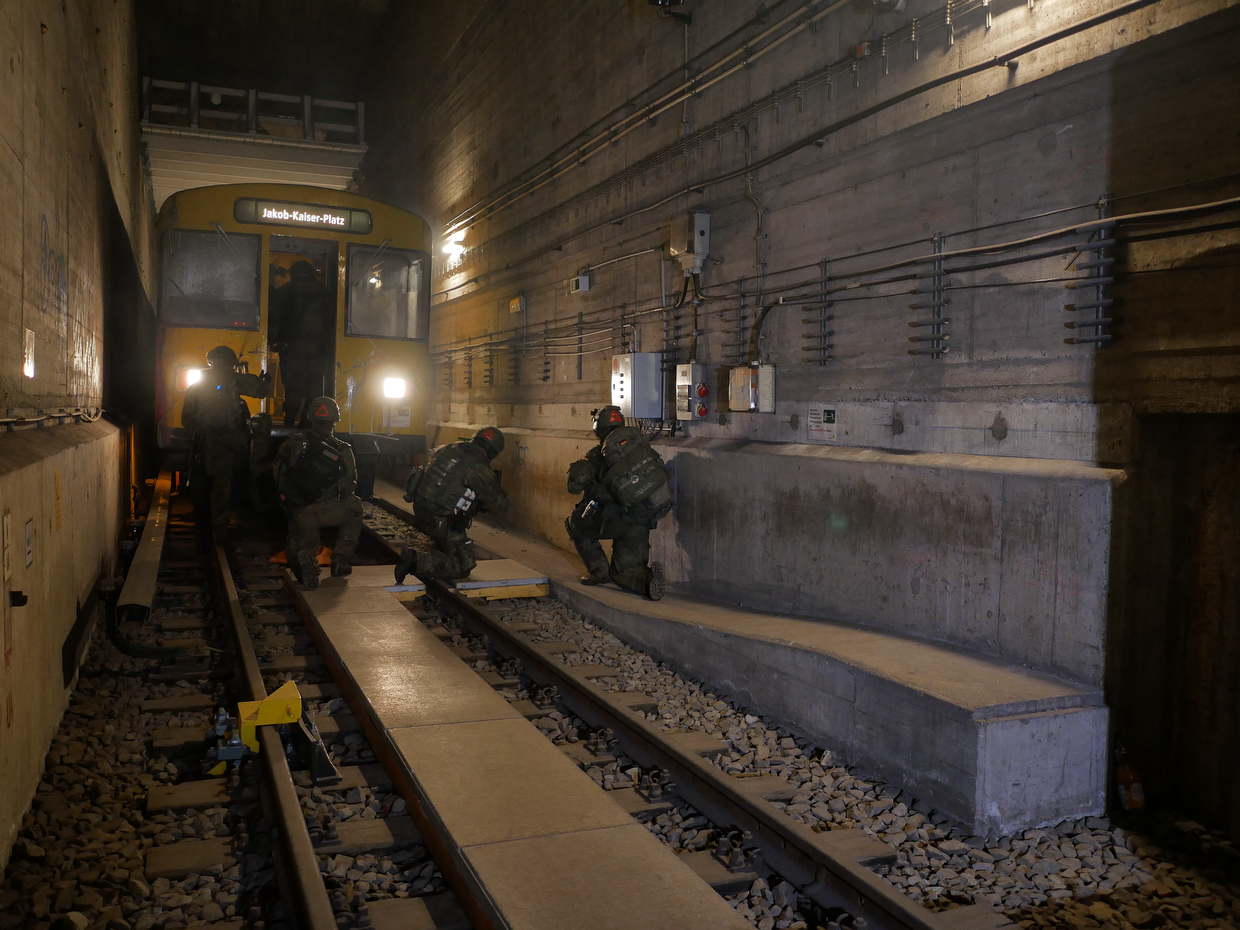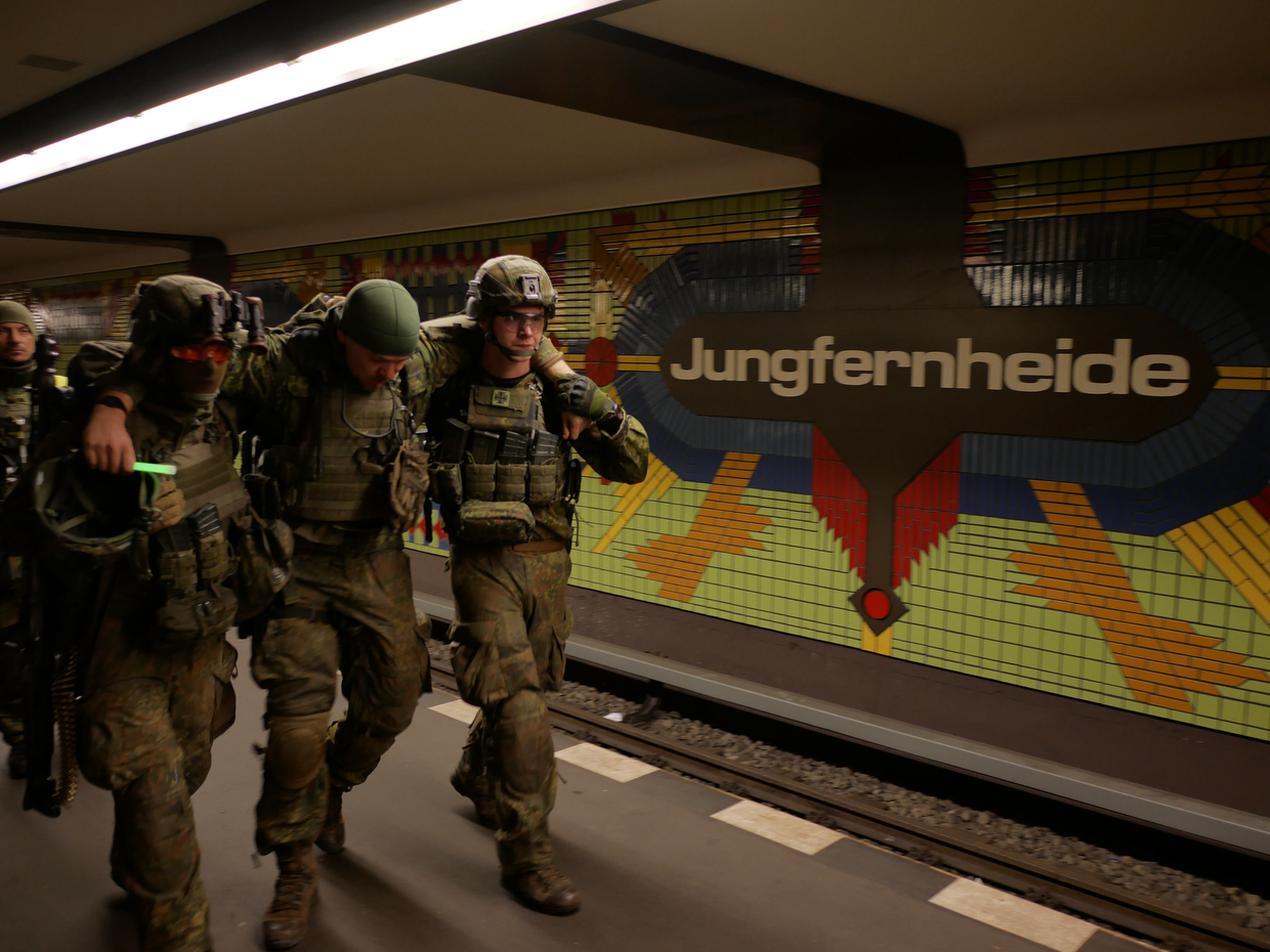 Auch ohne Einschränkungen für die Truppe ist das Szenario für die Soldaten und Soldatinnen der 2. und 3. Kompanie des Wachbataillons fordernd genug: Ein U-Bahn-Zug mit zahlreichen Soldaten an Bord wurde vor einem U-Bahnhof mit Gewalt gestoppt. Die Täter, nach Bundeswehr-Einschätzung Irreguläre Kräfte, halten sich noch im Tunnel auf. Truppweise dringen die Soldaten in den Tunnel ein, finden Verwundete im Zug vor – und müssen sich eines gegnerischen Angriffs erwehren.