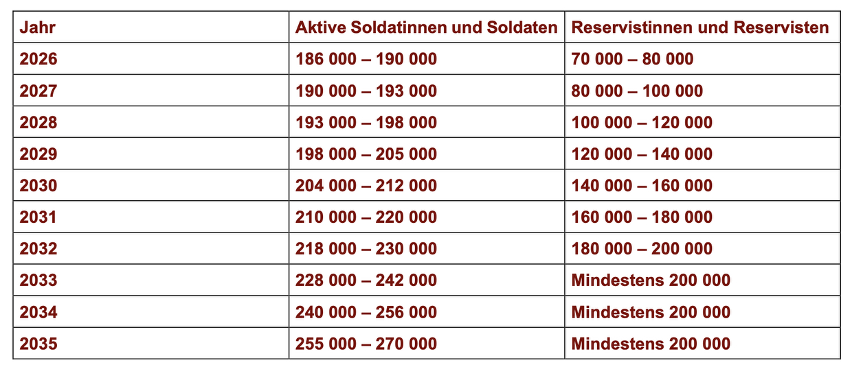 daten und mindestens 200 000 Reservistinnen und Reservisten zur Erfüllung der NATO-Fähigkeitsziele, vorgesehen. Dem liegt folgender