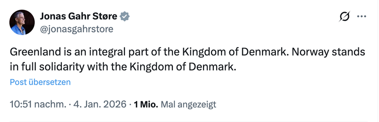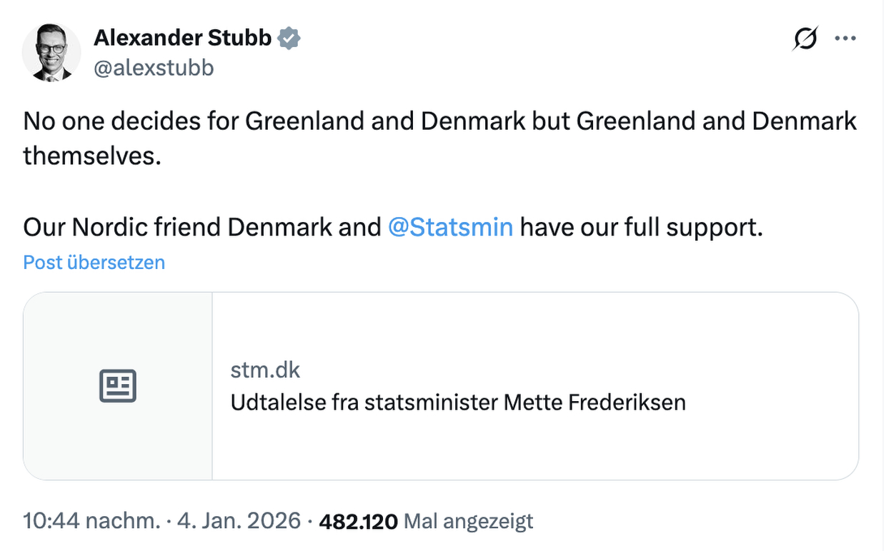 Die neue Weltunordnung wäre vielleicht die bessere Bezeichnung. Im Podcast 102 von Sicherheitshalber war deutlich erklärt worden, dass die USA ihren Anspruch als Ordnungsmacht, Welt-Polizist aufgegeben haben. Aber die neuen amerikanischen Ziele sind nicht friedfertiger geworden, sondern ganz im Gegenteil zeigt Venezuela, dass die USA jetzt eine unberechenbare Kabinenboot Politik mit Hinterhof Amerika betreiben. Die ständigen Drohungen gegen das NATO Mitglied Dänemark WG Grönland lassen sich durch nichts rechtfertigen! Insoweit fehlt hier im Artikel der Hinweis auf den Thread gestern bei X, wo die Ehefrau des stv. Staabschefs des Weißen Hauses, Grönland gepostet hat in den Farben der US Flagge, was gestern gross rausgestellt & diskutiert wurde auf Twitter! Dies erweckt den Eindruck, dass die USA eine Invasion gegen Grönland gezielt vorbereiten! Eine solche Invasion wäre das Ende der NATO! Dänemark & die europäischen NATO Staaten sollten schleunigst Kampftruppen mit Schießbefehl auf Grönland stationieren! Da die USA einen Militärstützpunkt auf Grönland betreiben & selbst verschuldet viele weitere Stützpunkte geschlossen haben, kann es nicht um militärische Fragen gehen, sondern nur um den Raub von Rohstoffen. Denn es gibt keinen Grund anzunehmen, das Dänemark oder Grönland den USA die Wiedererrichtung von weiteren Stützpunktenn verweigern würden, wenn die USA weitere Stützpunkte zur Abwehr von Russland erbitten würden. Aber man muss eben freundlich fragen & die Souveränität von Dänemark respektieren.