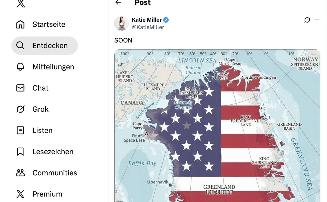 Nachgetragen, hatte ich erst vergessen: Bereits am vergangenen Freitag hatte Katie Miller, die Ehefrau von Trumps Vize-Stabschef Stephen Miller, mit einem Post auf X die Debatte angeheizt. Die Optik oben als Aufmacherfoto.