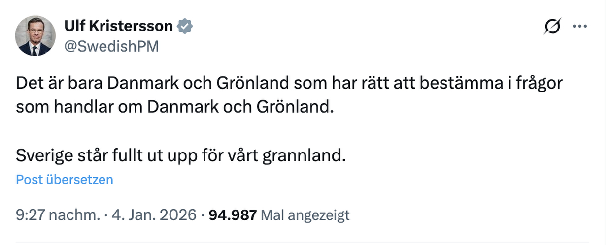 Nur Dänemark und Grönland haben das Recht, über Angelegenheiten zu entscheiden, die Dänemark und Grönland betreffen.Schweden steht voll und ganz hinter unserem Nachbarland.