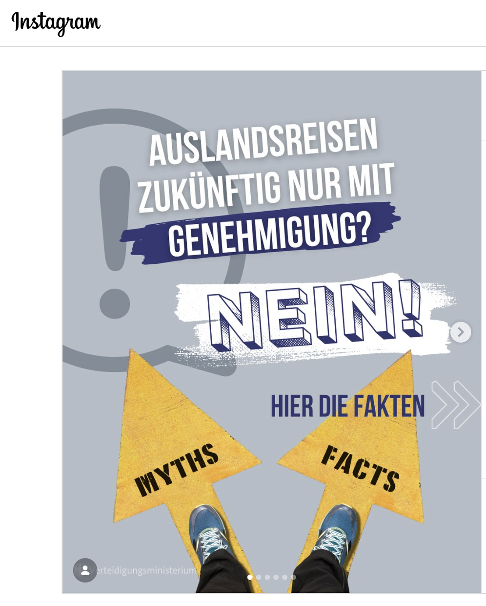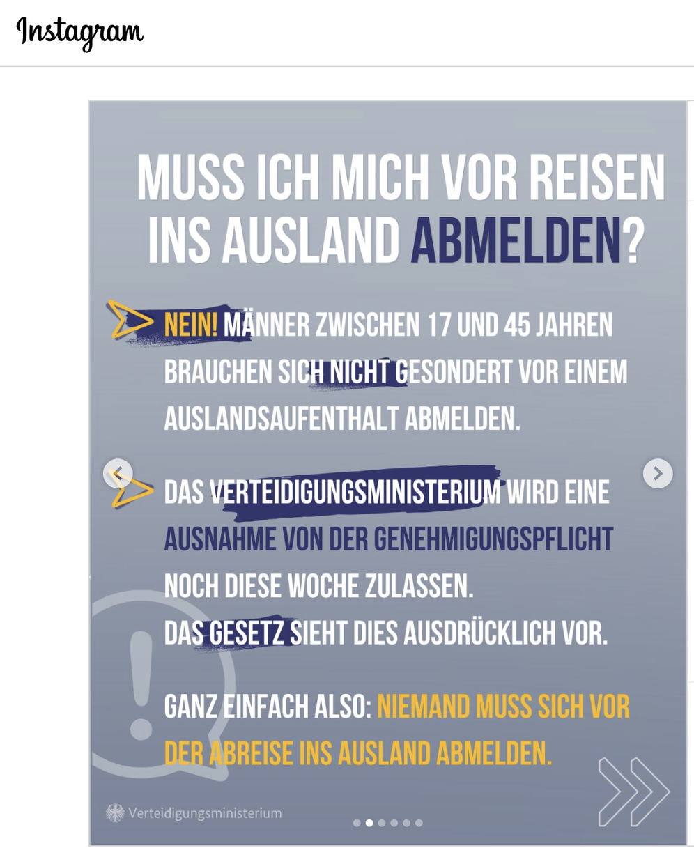 Nach einer heftigen Debatte am Wochenende über die neue Genehmigungspflicht für lange Auslandsaufenthalte deutscher Staatsbürger hat das Verteidigungsministerium auch auf social media reagiert. So veröffentlichte das Ministerium mehrere Grafiken, in denen die Berichterstattung über den entsprechenden Paragraphen in dem vom Ministerium formulierten und vom Bundestag verabschiedeten Gesetz in die Nähe von Mythen gerückt wird.
