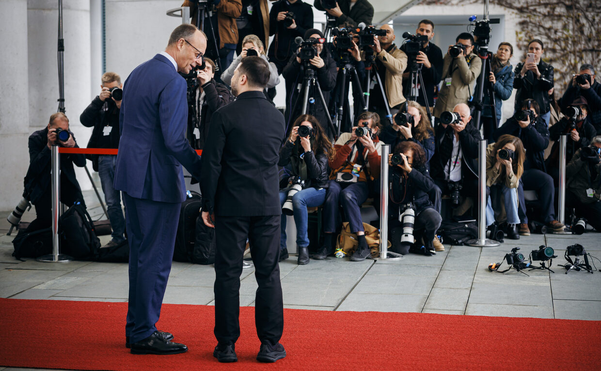 (Foto: Bundeskanzler Friedrich Merz, l., und der ukrainische Präsident Wolodymyr Selensky stellen sich vor dem Kanzleramt den Fotografen – Felix Zahn/photothek.de)